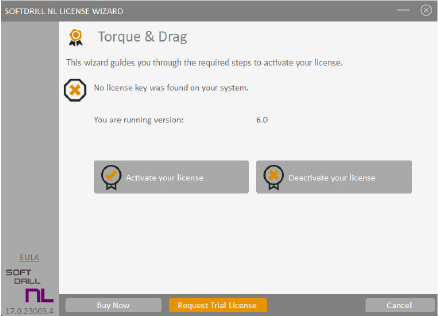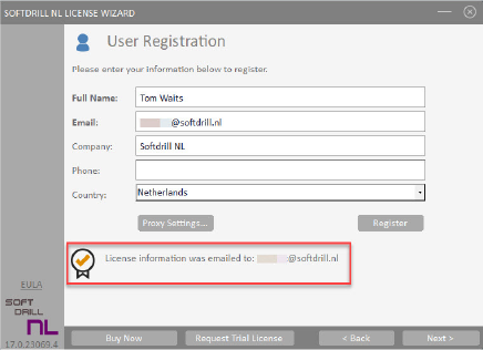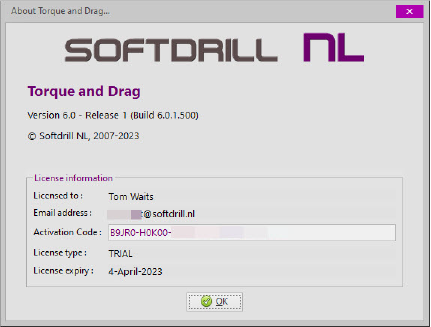 All Softdrill NL program have a menu option Help – About… This option will show a dialog box that will display information on the program (version and copyright) as well as information on your license.
