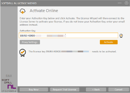 Input the Activation Code you received in the License Wizard. Preferably use copy & paste to avoid typing errors. A message will be displayed that the License Key needs to be activated.